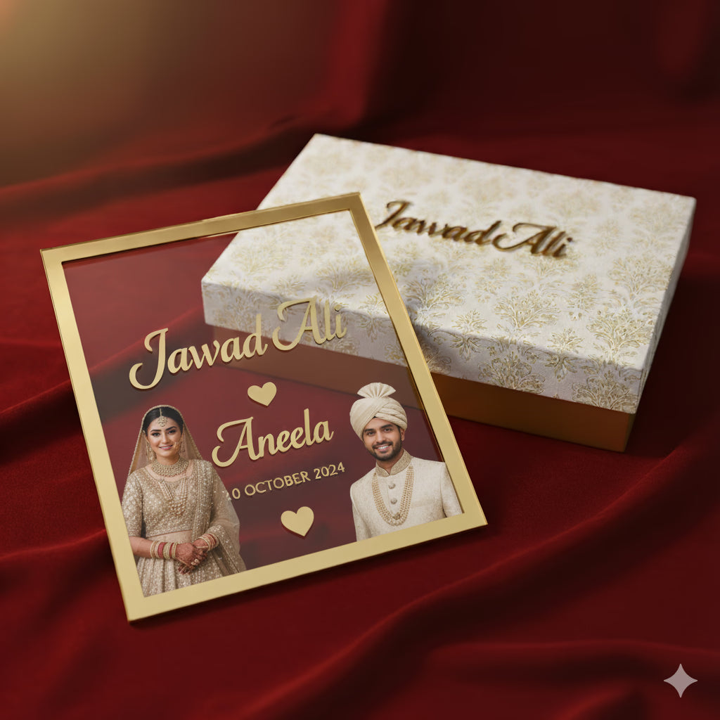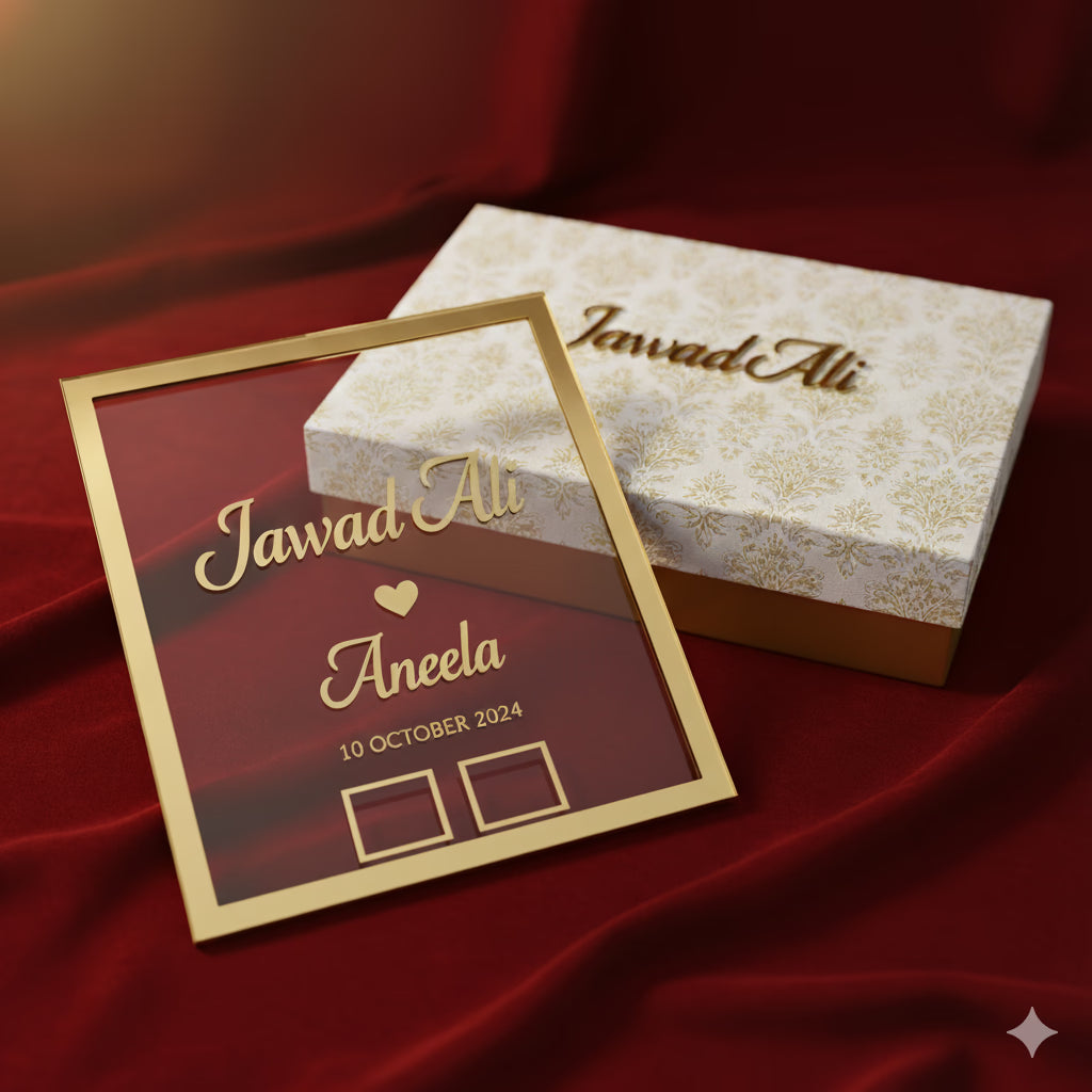 Celebrate the most sacred moment of your love story with this beautifully crafted Heart-Shaped Nikah Acrylic Frame. Designed to preserve the warmth of “Qubool Hai”, this elegant keepsake showcases your favourite Nikah photo along with your names and date in a romantic & modern calligraphy style.